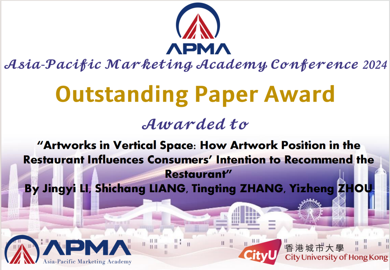 5月10日至12日,第二届亚太营销国际学术会议(APMA 2024)在香港城市大学召开。必赢官网梁世昌副教授指导的2022级硕士研究生李静益、张婷婷的论文《垂直空间中的艺术品:餐厅中艺术品的位置如何影响消费者推荐餐厅的意向》(Artworks in Vertical Space: How Artwork Position in the Restaurant Influences Consumers' Intention to Recommend the Restaurant)获杰出论文奖。李静益、张婷婷作为研究生代表参加了会议。
