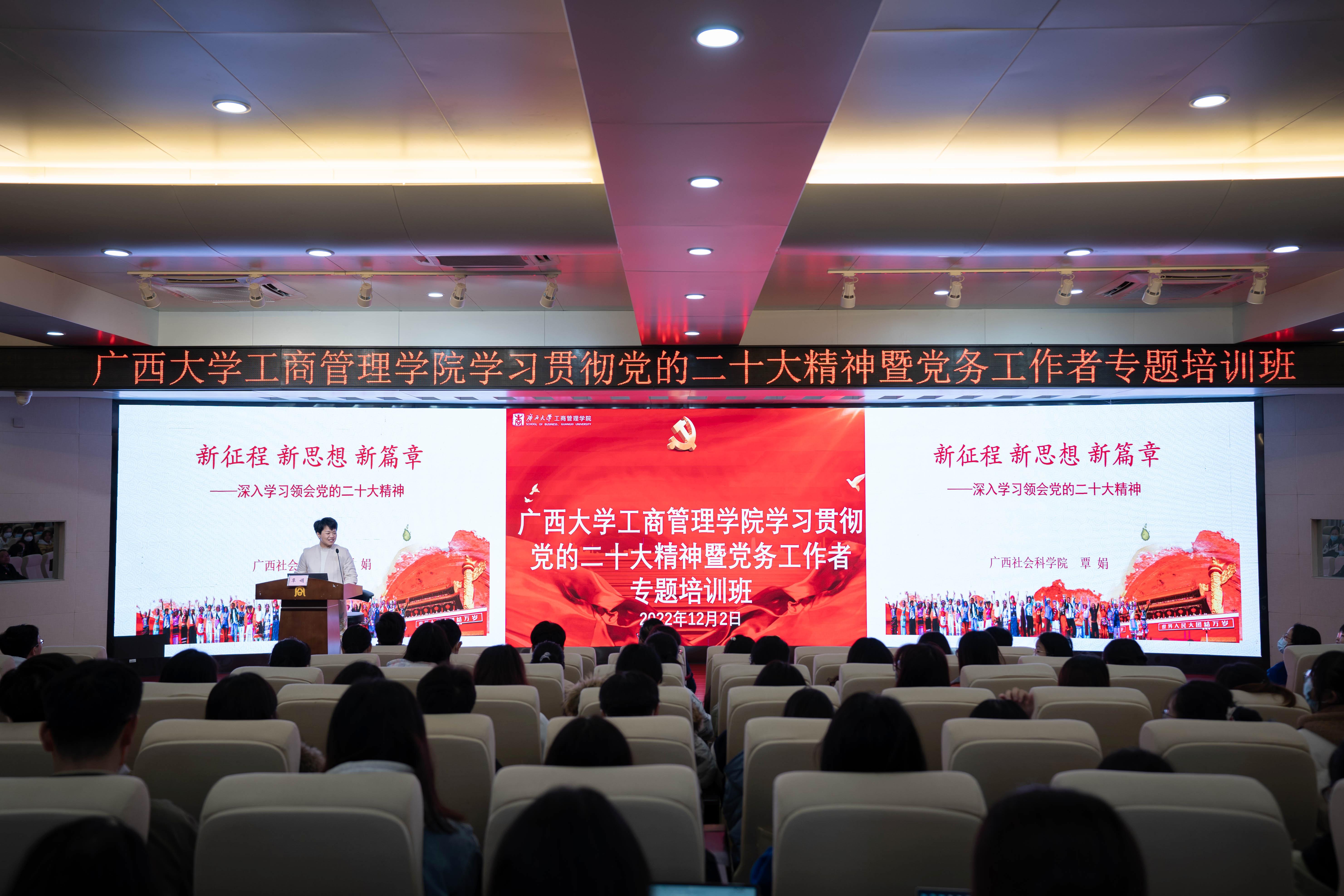 为帮助全院师生员工学习领会党的二十大精神,12月2日下午,自治区党委讲师团、区直机关工委讲师团聘任专家,广西社会科学院民族研究所所长、研究员覃娟受邀在学院128报告厅,为必赢官网党务工作者专题培训班学员作党的二十大精神宣讲报告。学院党委书记罗诚主持报告会。全院党务工作者、有关党员干部和师生到场聆听了报告。