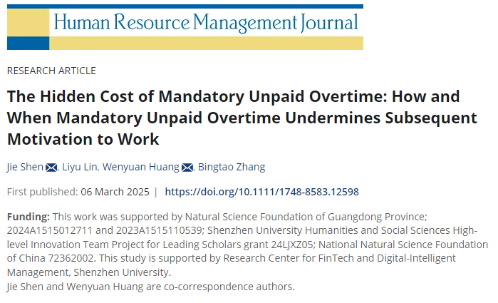 近日,必赢官网黄文远老师在人力资源管理领域研究取得新进展,利用日记记录和人工智能面部识别技术新型研究方法,探讨无偿性强制加班对员工工作动机的影响作用。相关成果以“The Hidden Cost of Mandatory Unpaid Overtime: How and When Mandatory Unpaid Overtime Undermines Subsequent Motivation to Work”为题,在人力资源管理领域国际顶级期刊《Human Resource Management Journal》发表。论文合作者包括深圳大学沈捷教授及其硕士研究生林丽玉、博士研究生张冰涛。