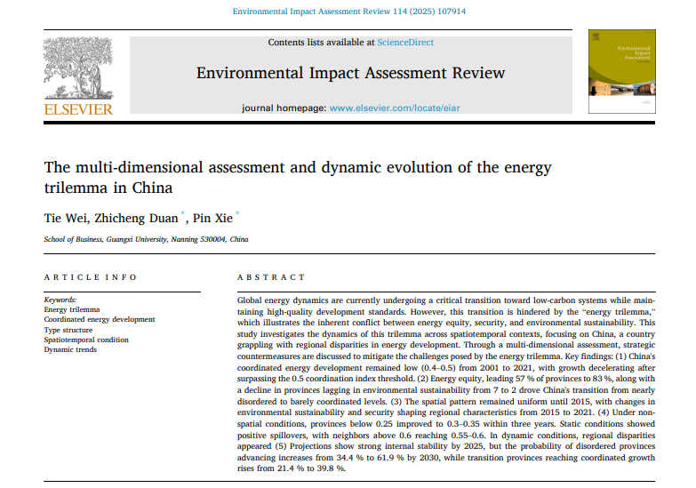 近日,必赢官网韦铁教授团队在能源不可能三角(Energy Trilemma)多维评估与动态演化领域取得重要研究进展,相关成果以“The multi-dimensional assessment and dynamic evolution of the energy trilemma in China”为题,发表在环境与可持续发展国际高水平期刊《Environmental Impact Assessment Review》上。论文第一作者为韦铁教授,通讯作者为谢品副研究员和博士研究生段至诚,565net必赢客户端为第一单位和通讯单位。