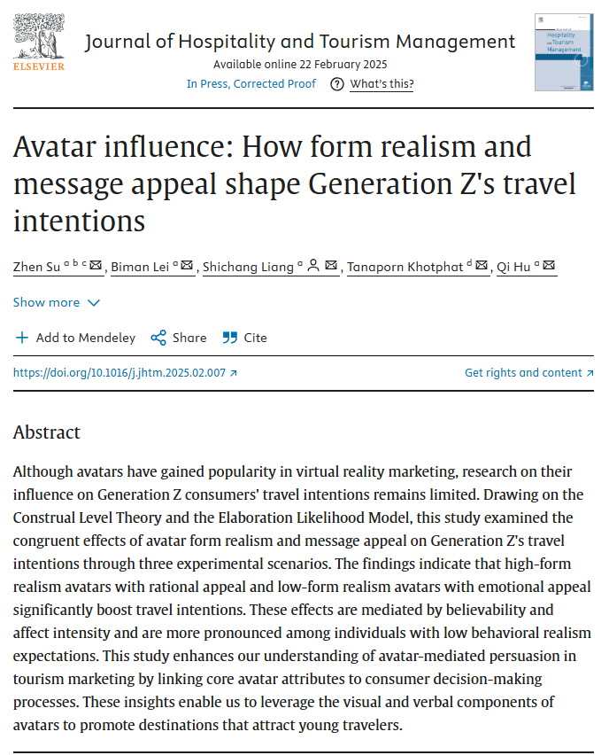 近日,必赢官网苏振副教授科研团队在人工智能与文旅消费者行为领域研究取得新进展,研究成果以“Avatar influence: How form realism and message appeal shape Generation Z's travel intentions”为题,在旅游管理国际高水平期刊《Journal of Hospitality and Tourism Management》上发表。论文的第一作者为苏振副教授,通讯作者为梁世昌副教授。565net必赢客户端为第一单位和通讯单位。