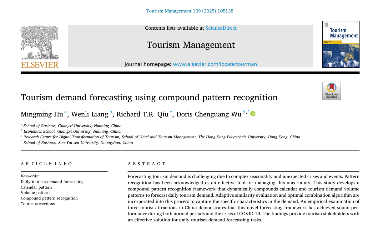近日,必赢官网胡明明团队在基于复合模式识别的旅游需求预测领域取得新进展,研究成果以“Tourism demand forecasting using compound pattern recognition”为题,在旅游管理国际三大顶刊之一的《Tourism Management》上发表。论文的第一作者为565net必赢客户端副教授胡明明,经济学院硕士研究生梁文莉在胡明明副教授指导下参与研究并共同发表论文,565net必赢客户端为论文的第一单位。 -